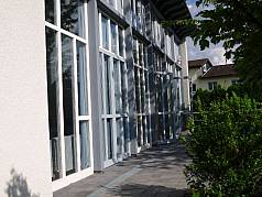 Vorplatz und Eingangsbereich der Kirche, Treffpunkt für Gottesdienst- und Konzertbesucher, liegen leicht erhöht und sind über einige Stufen zu erreichen. Die Bepflanzung lockert den Platz auf, nimmt ihm etwas von seiner Strenge und lädt zum Verweilen ein. Die auffallend große und hoch gebaute Kirche ist weithin sichtbar, vor