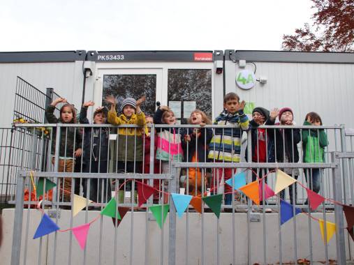 Die letzten Wochen und Monate waren für alle Beteiligten sehr spannend und arbeitsintensiv, der Zeitplan knapp und die Unwägbarkeiten zahlreich. Nun wo alles steht und die Betriebserlaubnis erteilt ist, kann es endlich los gehen. Die Kinder konnten den Umzug kaum erwarten. Zwar sahen sie dem Abschied von der vertrauten Umgebung in der Biegenstraße 18 mit gemischten Gefühlen entgegen, wobei aber die Freude über das neue Quartier überwiegt. Das ist ohne Frage der Verdienst der Erzieherinnen und der Kindergartenleiterin Bernadette Baumgarten, die mit viel spielerischem Feingefühl die Kinder auf den Umzug vorbereitet haben. „Die Kinder wurden in viele Entscheidungen einbezogen. Zum Beispiel überlegten wir gemeinsam, welche Möbel wir mit umziehen wollen, oder wie die neuen Räume heißen sollen, damit sich jeder in der noch unbekannten Umgebung zurechtfindet. Dabei haben die Kinder viel Kreativität bewiesen“, sagt Bernadette Baumgarten. So wird es im Übergangskindergarten einen Phantasie-Bau Raum, einen Krims-Krams-Raum und einen Kuschel- und Bücherraum geben.